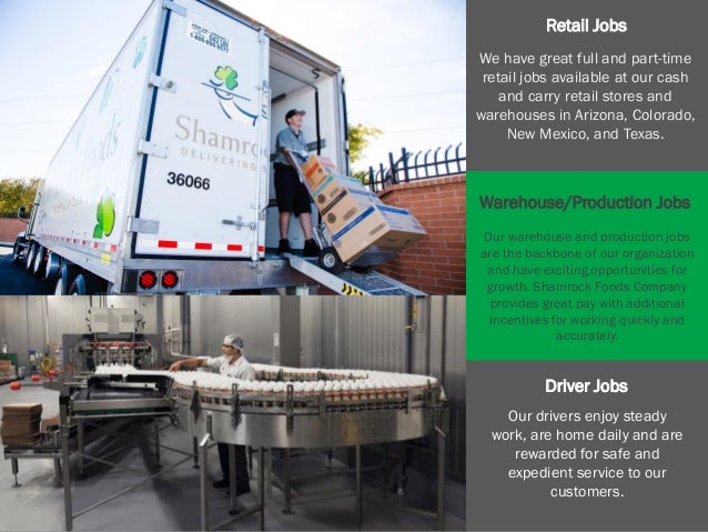 Shamrock foods is a nationally ranked food distribution company with a history dating back to 1922. Shamrock foods distributes fresh and frozen foods, specialty items and gourmet foods to food shamrock manufactures its own dairy products under the shamrock farms label. Find high paying available jobs at shamrock foods.for expert network information on shamrock foods compensation and careers, use ladders $100k + club. Please browse all of our available job and career opportunities. Unfortunately, there are no postings for shamrock foods jobs on ziprecruiter at this time, but here are some popular searches in your area.